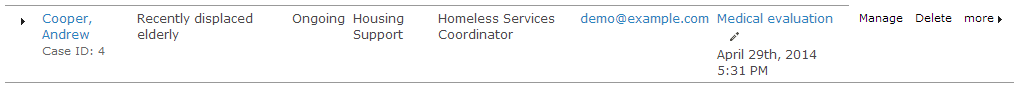Click on the triangular expand icon (►) to the left of the client name to see the complete list of activities for that case. From this list you can view or edit any activity in that case. Click Manage Case when you want to work on a number of tasks within a case or to change the status of the case, print a case report, or view case roles.