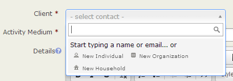 Use the Details text area to add information pertaining to the overall case, but not to a specific activity of the case. An example might be "Jane is concerned about some illegal land use that she has witnessed in her neighbourhood, and would like us to see what can be done about it. I told her that the best person to look into this was Tom, and she asked whether her husband could be included on any correspondence."