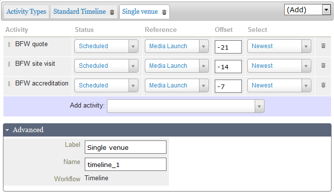 You can rename additional timelines or a sequence using the fields available in the 'Advanced' section below the main Activities section of the page as shown above.