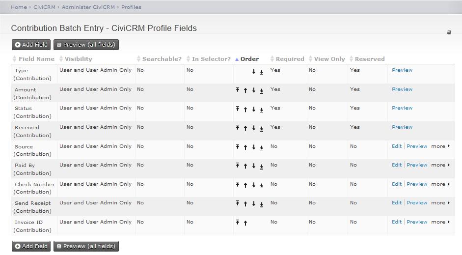 Above is CiviCRM’s default configuration for the Contribution Batch Entry profile, which is used when you record information about a contact’s contribution or pledge payment.