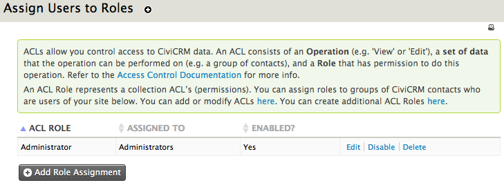 Once the roles are configured, you can begin to assign them to users. In CiviCRM this is done in two steps: