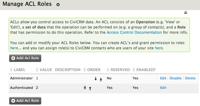 Each CMS also has other predefined roles giving varying amounts of access to CiviCRM. Again you can change the permissions granted to these roles but you must make sure that there is always one role (Administrator/Super Users/Admin) that has the ability to administer CiviCRM including managing access control.