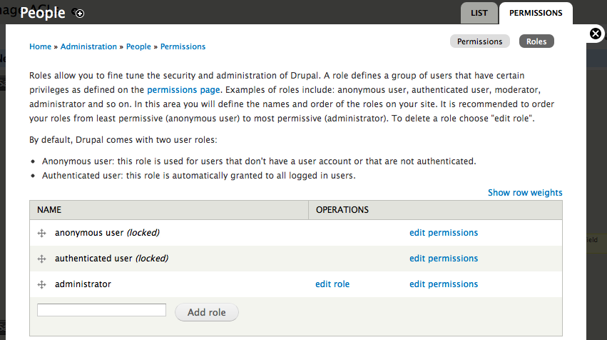This is where you can create ACL roles. By default you will have "administrator" and "authenticated" (logged in), but only the administrator role may be edited; "authenticated" is a reserved role and core to the system.