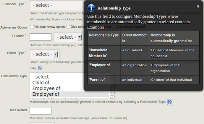 The pop-up help screen gives examples of the relationship types to select for this feature. Once you have selected a relationship type, you enter a number in Max related to set a maximum for the number of inherited memberships linked to each primary member. This would be useful, in the example above, to limit the number of employees that can become a member by virtue of their employment to 10 maximum.
