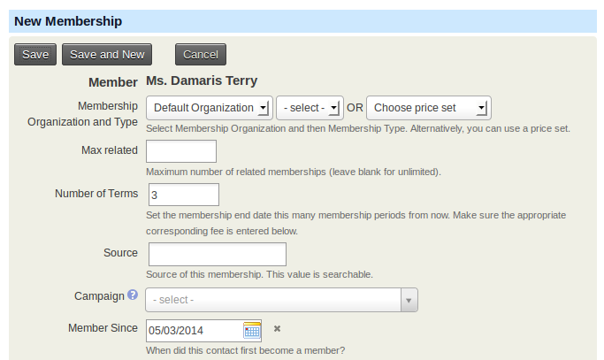 Number of Terms:enter the number of membership periods or terms associated with this membership record. The membership end date will then be set to an end date for this number of terms (this option is hidden when using membership price sets)