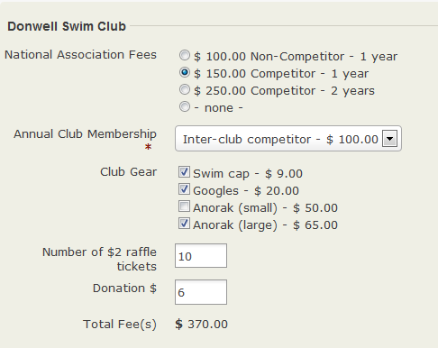 The Donwell Swim Club price set consists of five price fields: National Association Fees, Annual Club membership, Club Gear, raffle tickets and donation.