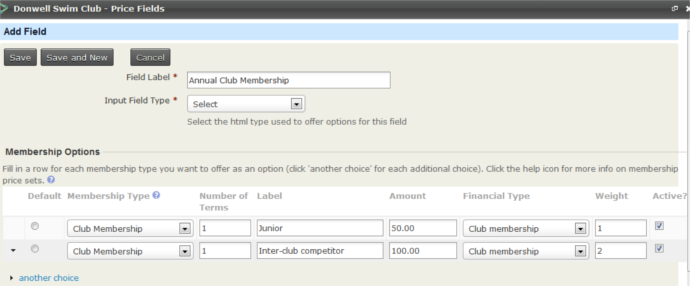 There are three non-membership price fields in our example. The first offers a selection of club branded swimming gear. The checkbox field type lets people choose more than one item from the options offered.