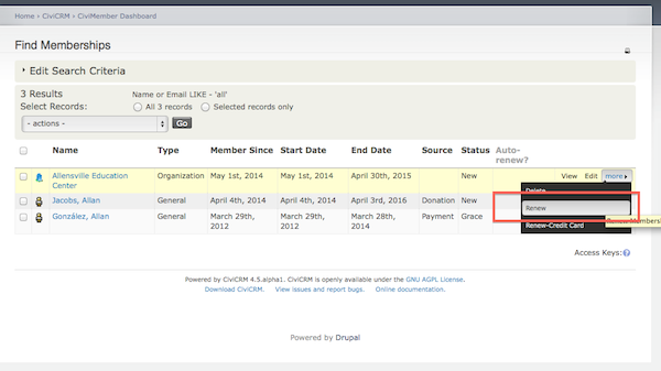 **A "renew" link pointing to that page will then be displayed on the Contact Dashboard for any memberships which were manually entered.