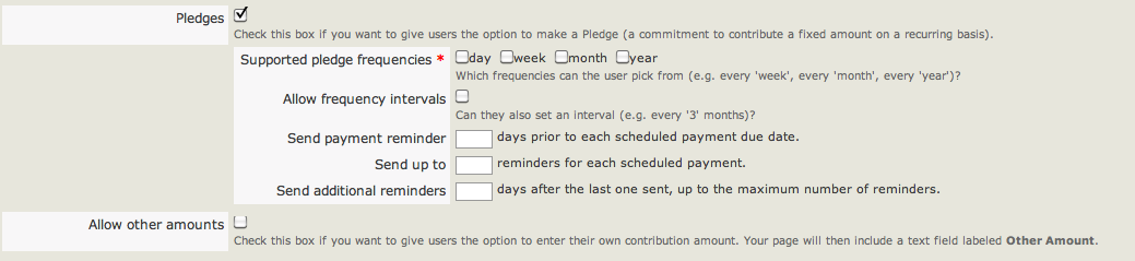 Setting up pledges for online forms is a simple check-box affair. Once a contribution page has been created (see the chapter 'Setup'), while editing the page's settings go to the 'Amounts' tab and tick the option 'Pledges'. Several options will appear, as below.