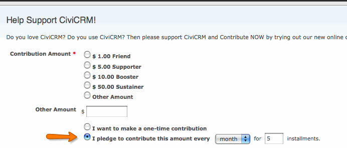 Within your online CiviContribute donation form, you may let your constituents make pledges for future donations. By allowing pledges, donors have the flexibility to choose the frequency with which they will donate, e.g. twice a year, twice a month for five months, etc. Some payment processors will not allow this kind of automation and the payments themselves may arrive in a non-electronic form like cheques. However, you can record future income against a current source such as an event or email campaign, and change the status from 'pledged' to 'complete/paid' manually when the payment arrives (should the payment method not support this). Pledges also provide an automated mechanism to remind donors of their commitment.