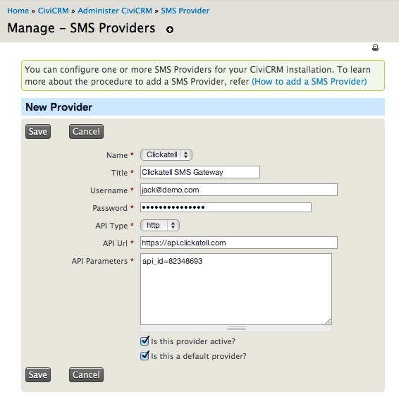 Is this a default provider?: check this option to make it the default, where multiple SMS providers are available